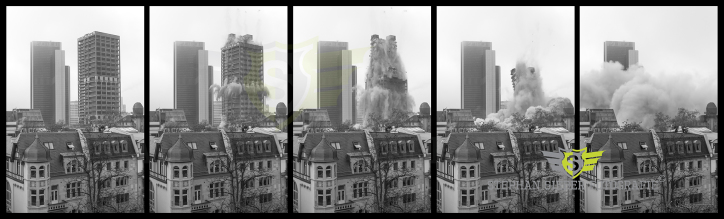 Collage der Sprengung des AfE-Turms in Frankfurt am Main am 02.02.2014.